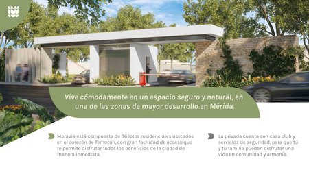 Moravia está compuesta de 36 lotes residenciales ubicados en el corazón de Temozón, con gran facilidad de acceso que te permite disfrutar todos los beneficios de la ciudad de manera inmediata.